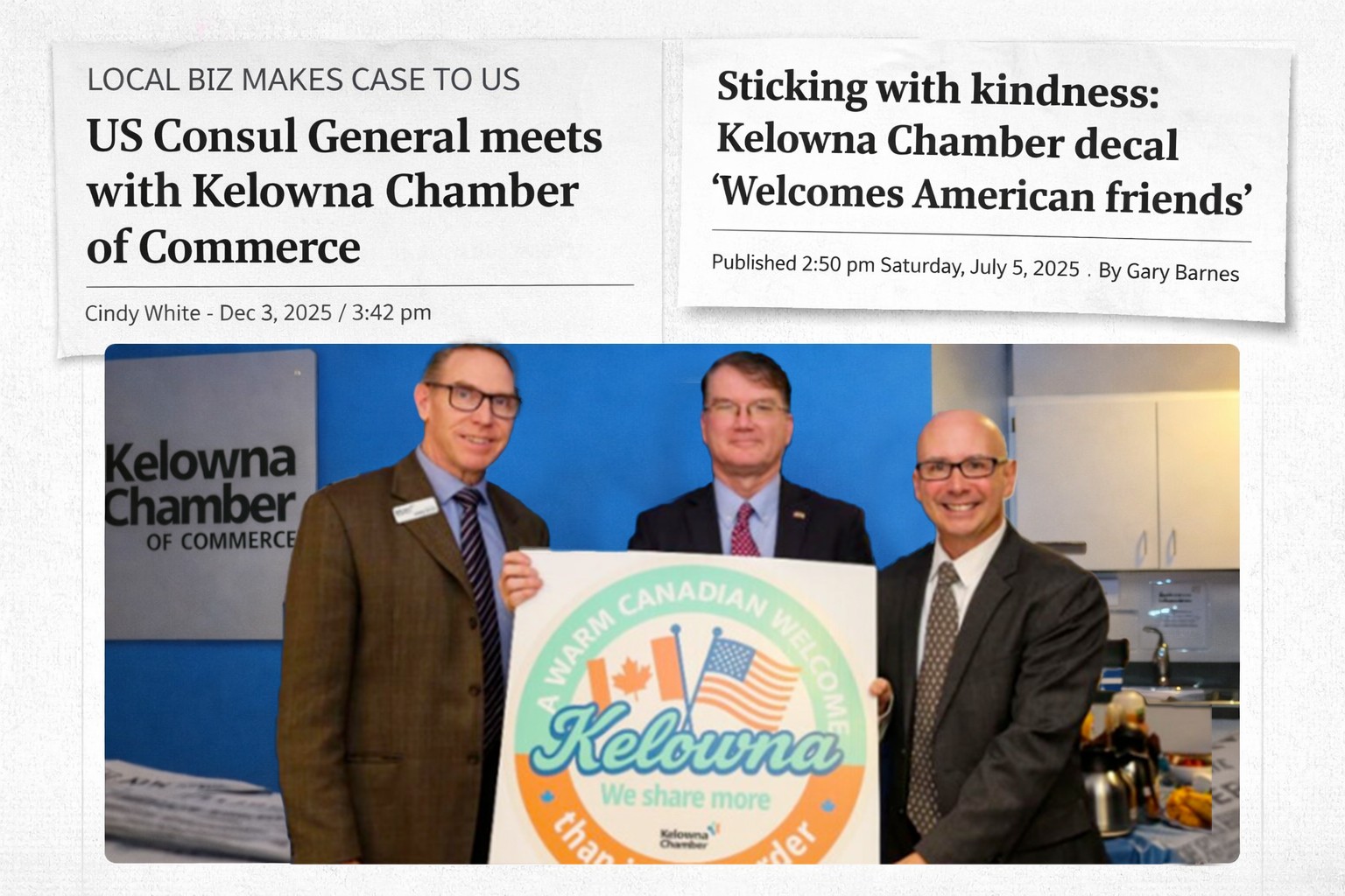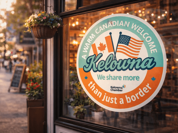 The Kelowna Businesses Welcome Decal was created as a simple, visible gesture of hospitality from the local business community during a period of growing political tension between Canada and the United States, including rhetoric such as Donald Trump referring to Canada as the “51st state.”